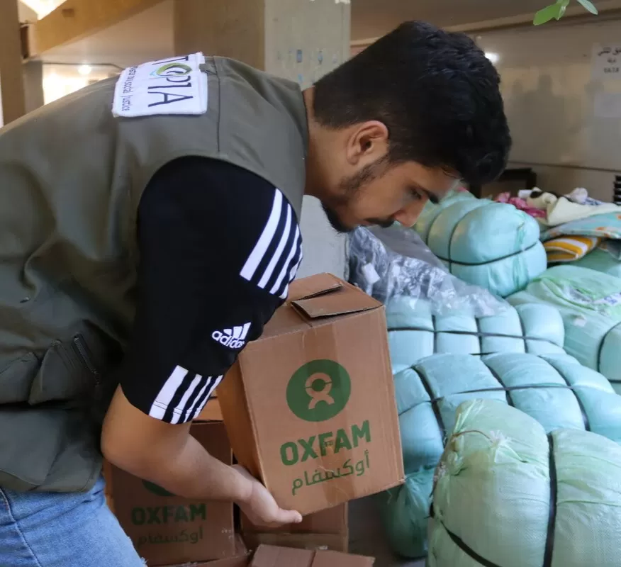 Mohammad, an aid worker from Oxfam’s local partner in north Lebanon distributes hygiene kits to displaced people at a collective shelter. Photo: Fatima Ghemrawi/Utopia for Social Justice/Oxfam