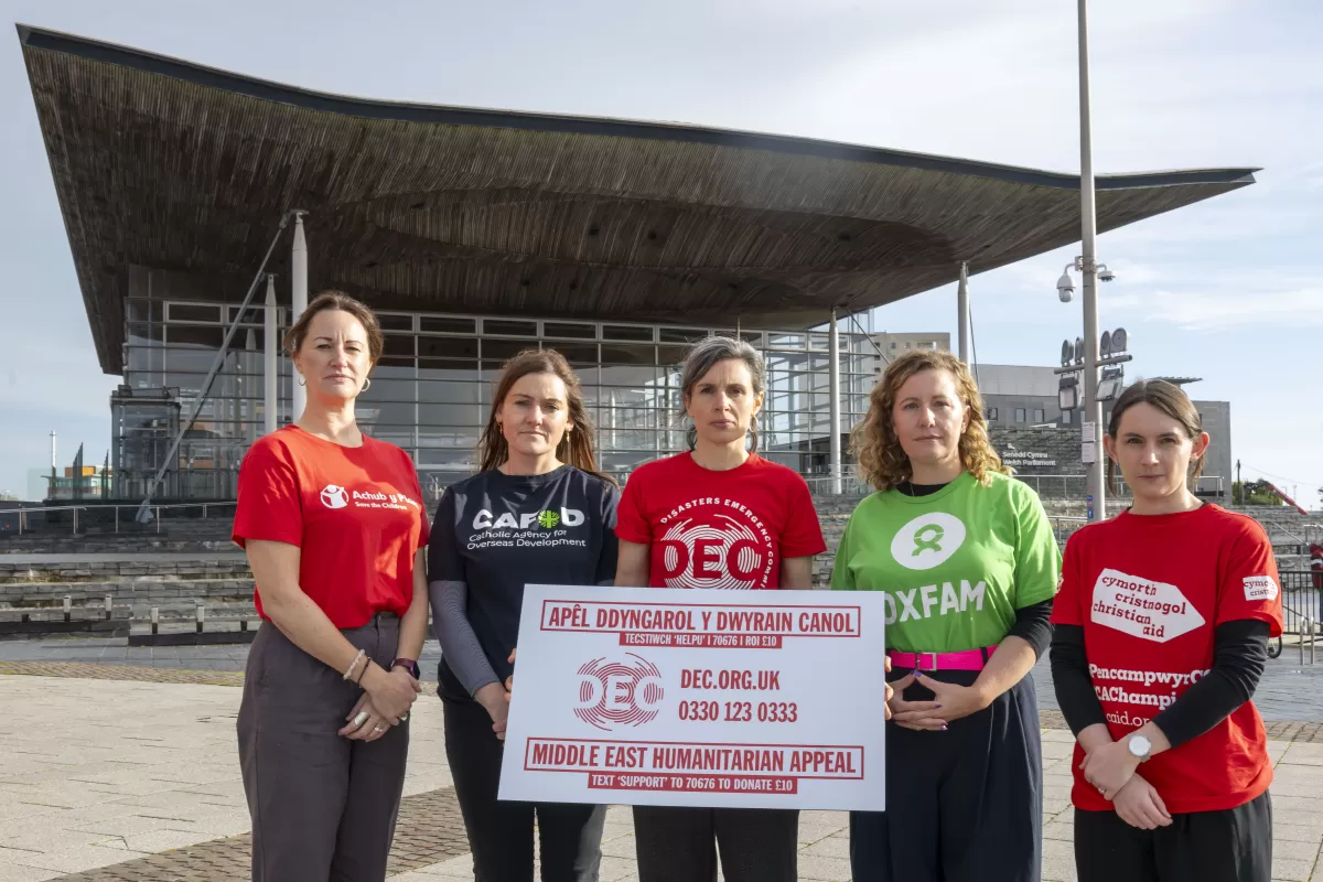 Representatives of four DEC member charities in Wales launch the Middle East Humanitarian Appeal in October 2024.
