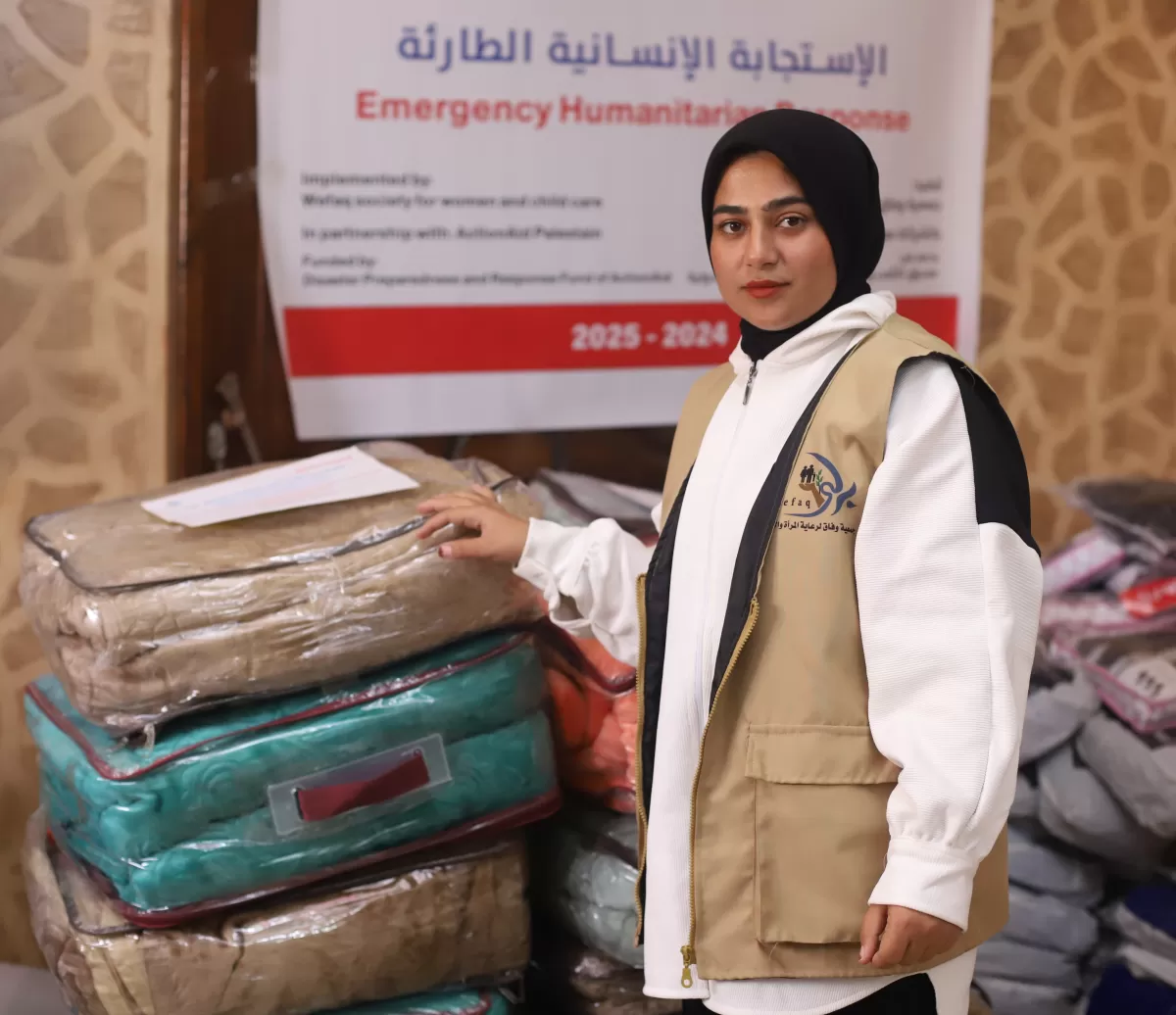 Salam, a volunteer with Wefaq organisation in Gaza and partner of DEC charity ActionAid, Feb 2025. Image: Wattan Media Network/ActionAid
