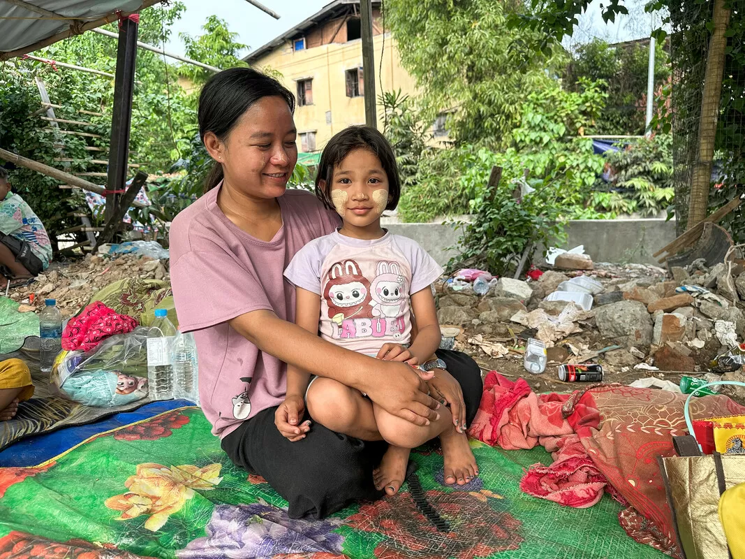 Ohma* sits with her daughter Opame* in a makeshift shelter where they are staying after being displaced by the earthquake in Myanmar, 8 April 2025. Image: Arete/DEC