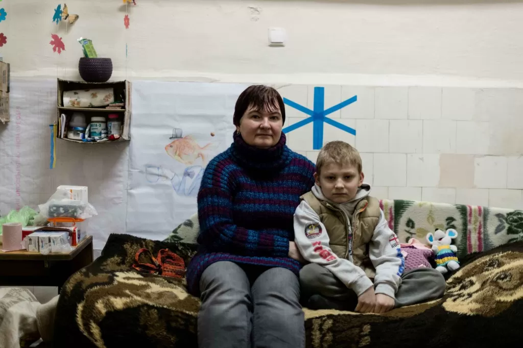 Schoolteacher Yulia and her son Kolia* in a public bomb shelter in Kharkiv, where her children are able to study online and she is able to teach through her mobile phone, thanks to the DEC-funded generators providing electricity. Photo: Maciek Musialek/DEC
