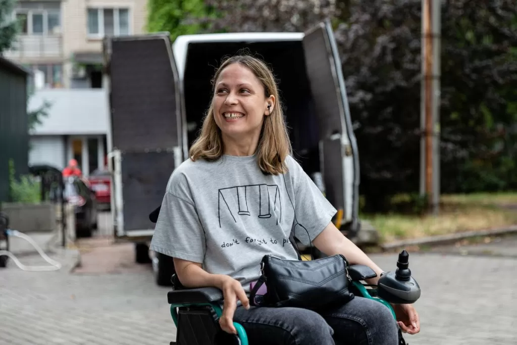 Anastasia* tries out one of the specially equipped taxis her new business will soon provide for people with disabilities in Mykolaiv. Photo: Katya Moskalyuk/DEC/Fairpicture