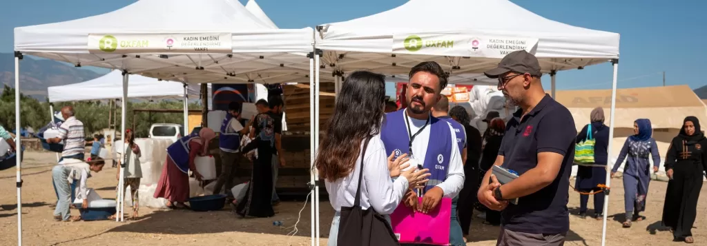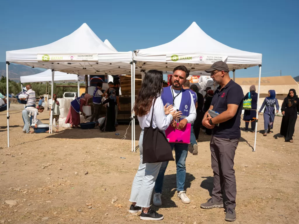 Saleh Saeed, DEC Chief Executive, speaks to local aid workers in a tent camp in Turkey where DEC charity Oxfam KEDV is distributing hygiene items following the earthquake. Photo: Özge Sebzeci/Fairpicture/DEC