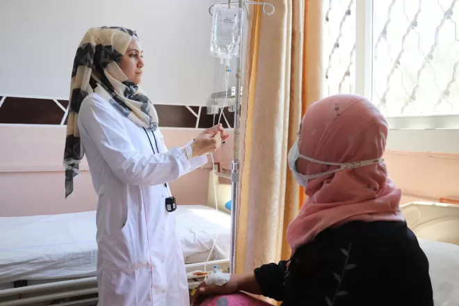 Haneen, Chief of Nursing at a hospital, sees to a patient. Photo: Sonya Al Ali Maara/Action Aid