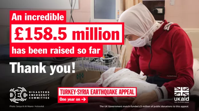 One year after devastating earthquakes hit Turkey and Syria, the DEC appeal has now raised an incredible £158.5 million, making it one of our largest ever appeals.