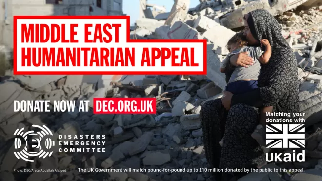 The UK Government will match the first Ā£10million of donations from the British public to the DEC’s Middle East Humanitarian Appeal to provide vital humanitarian assistance to people affected by conflict.