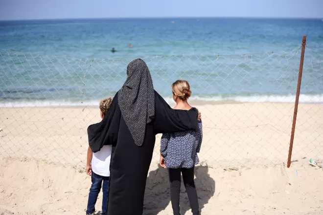 Darine and her children look out over the sea at their beachside camp. Image: Majdi Fathi, October 2