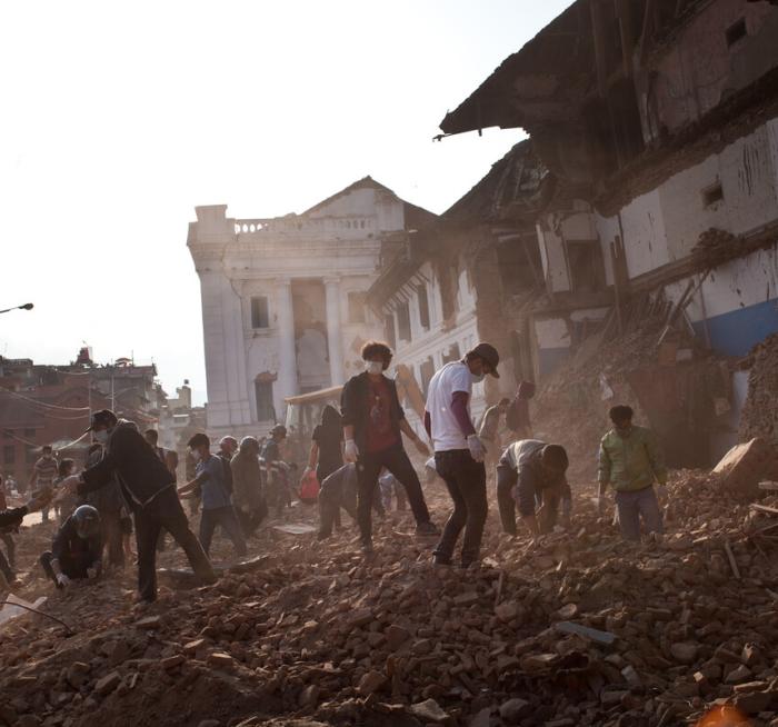 People clear a road in Kathmandu in the wake of the devastating earthquake.