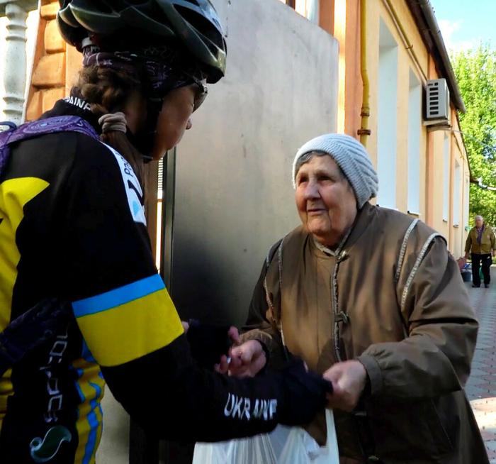 Viktoria, a cyclist volunteer delivers food to Larysa, an older resident of Kharkiv.